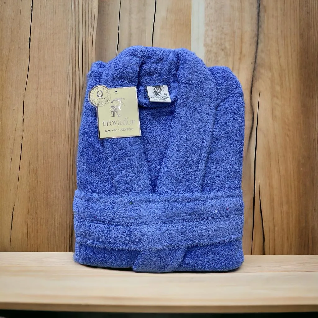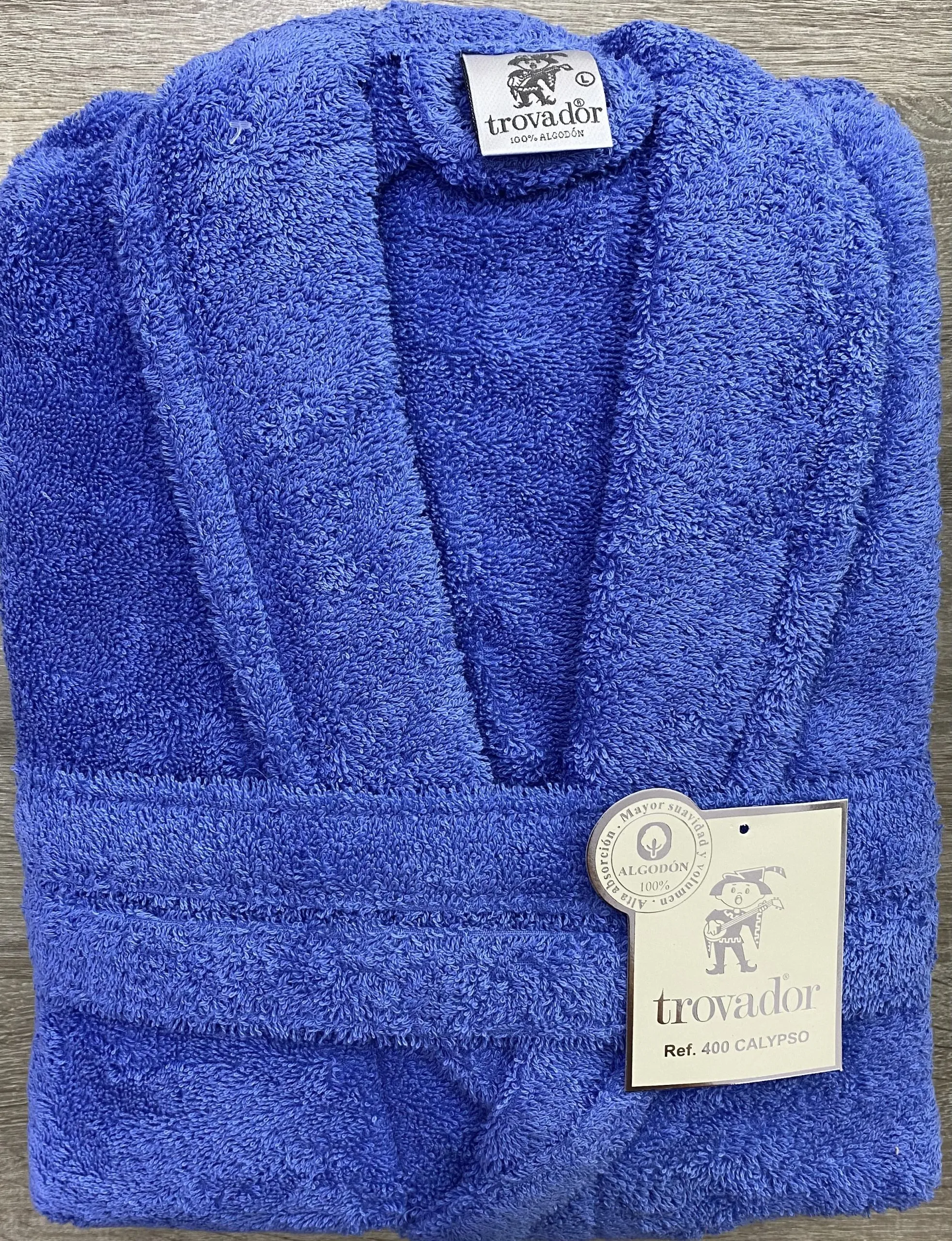 Albornoz baño color azul 100% algodón con la garantía de la marca Trovador. Con tejido de 400gr/m2 y tratamiento de alta absorción.