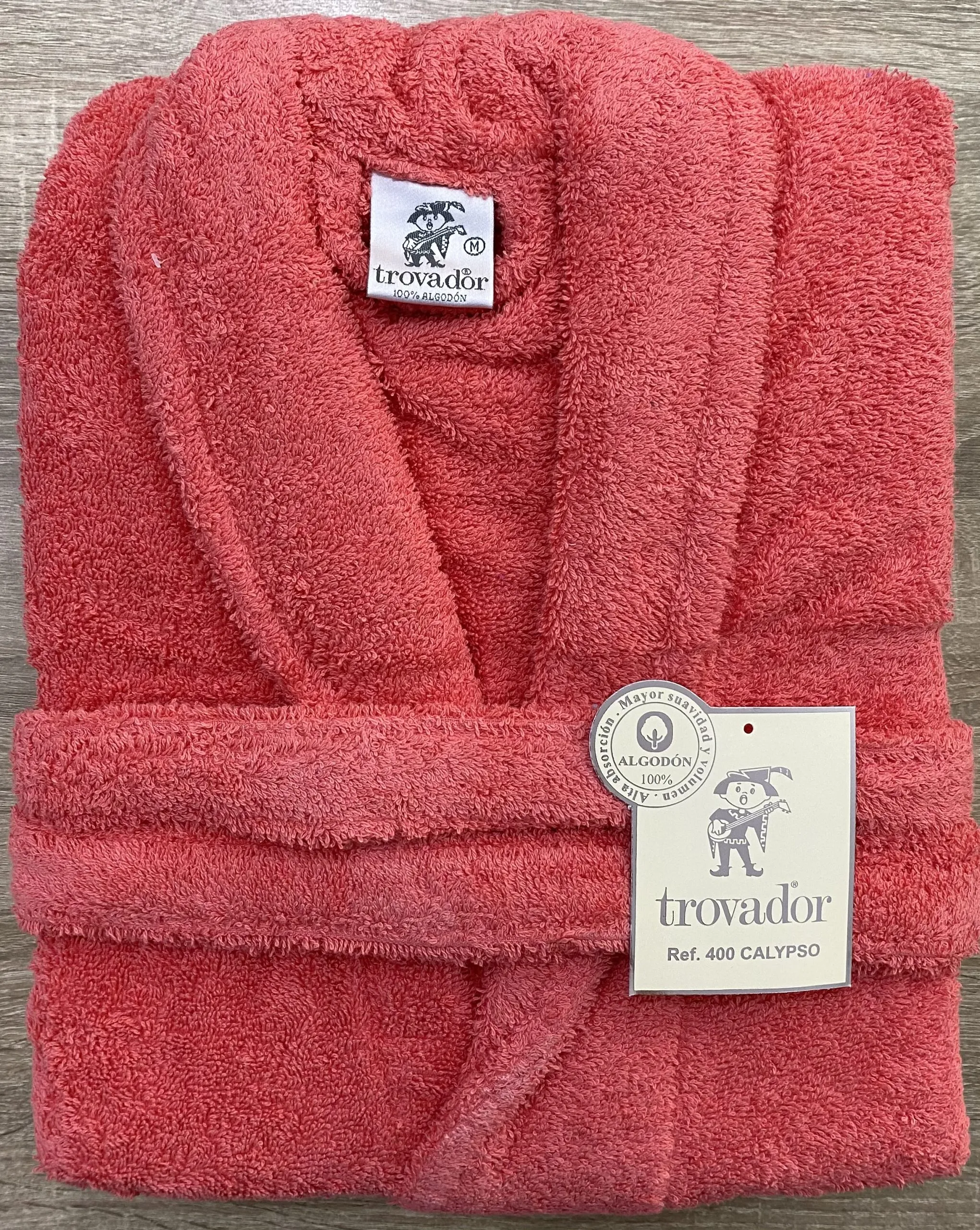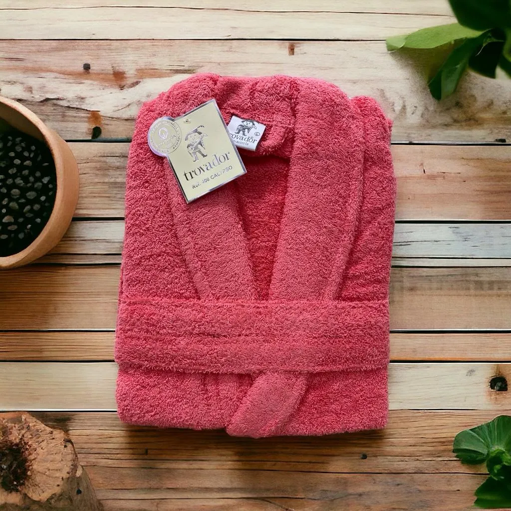 Albornoz color camelia 100% algodón con la garantía de la marca Trovador. Con tejido de 400gr/m2 y tratamiento de alta absorción.