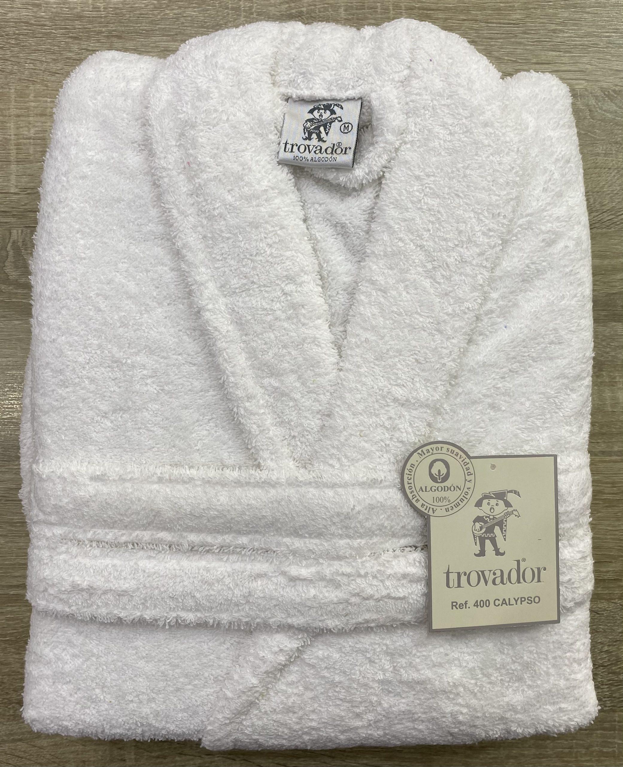 Albornoz blanco 100% algodón con la garantía de la marca Trovador. Con tejido de 400gr/m2 y tratamiento de alta absorción.