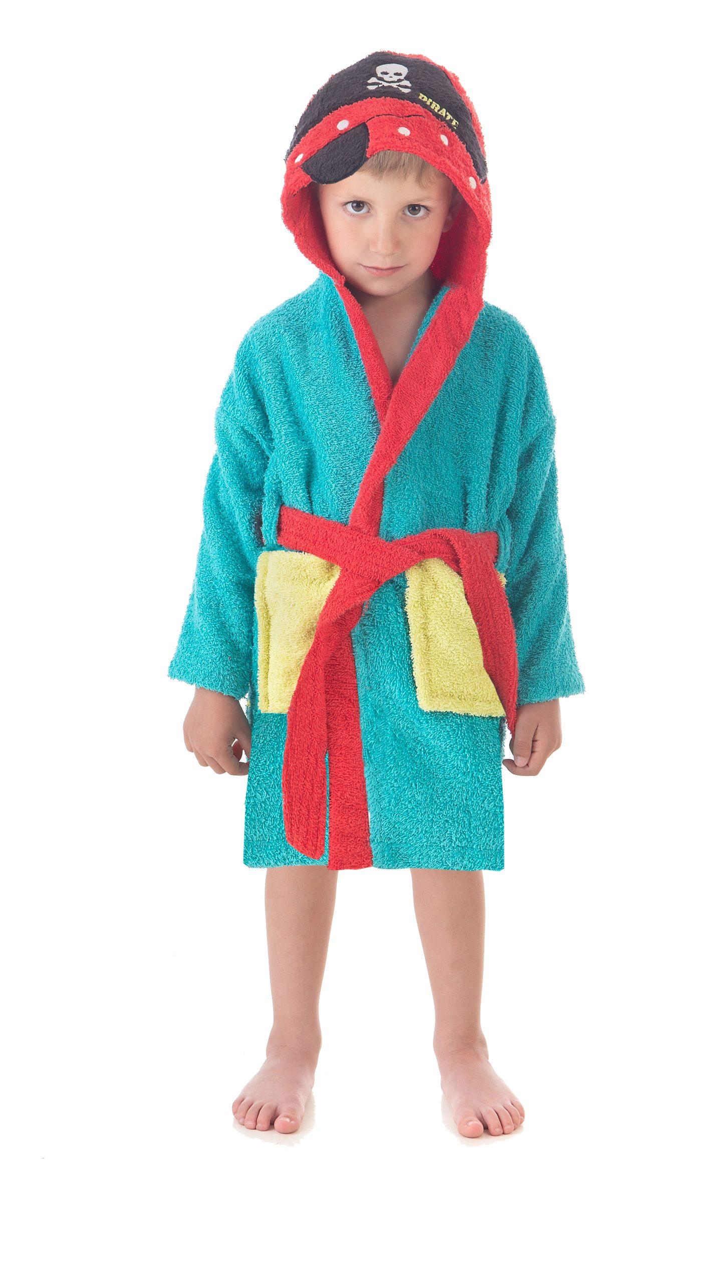 Albornoz de rizo 100% algodón de 400gr/m, ideal para los niños con un diseño muy divertido en azul con bolsillos en amarillo y cinturón en rojo  con capucha de piratas.