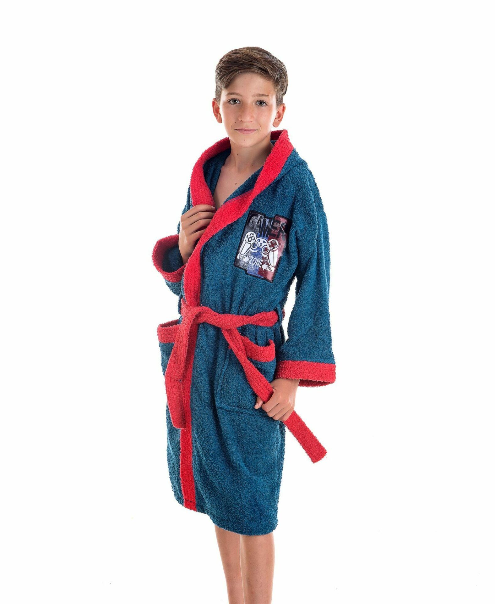 Albornoz niño de rizo y con capucha es de color azul marino y con el cinturón y los detalles de los bolsillos en rojo, lleva un dibujo cosido de un mando de consola.