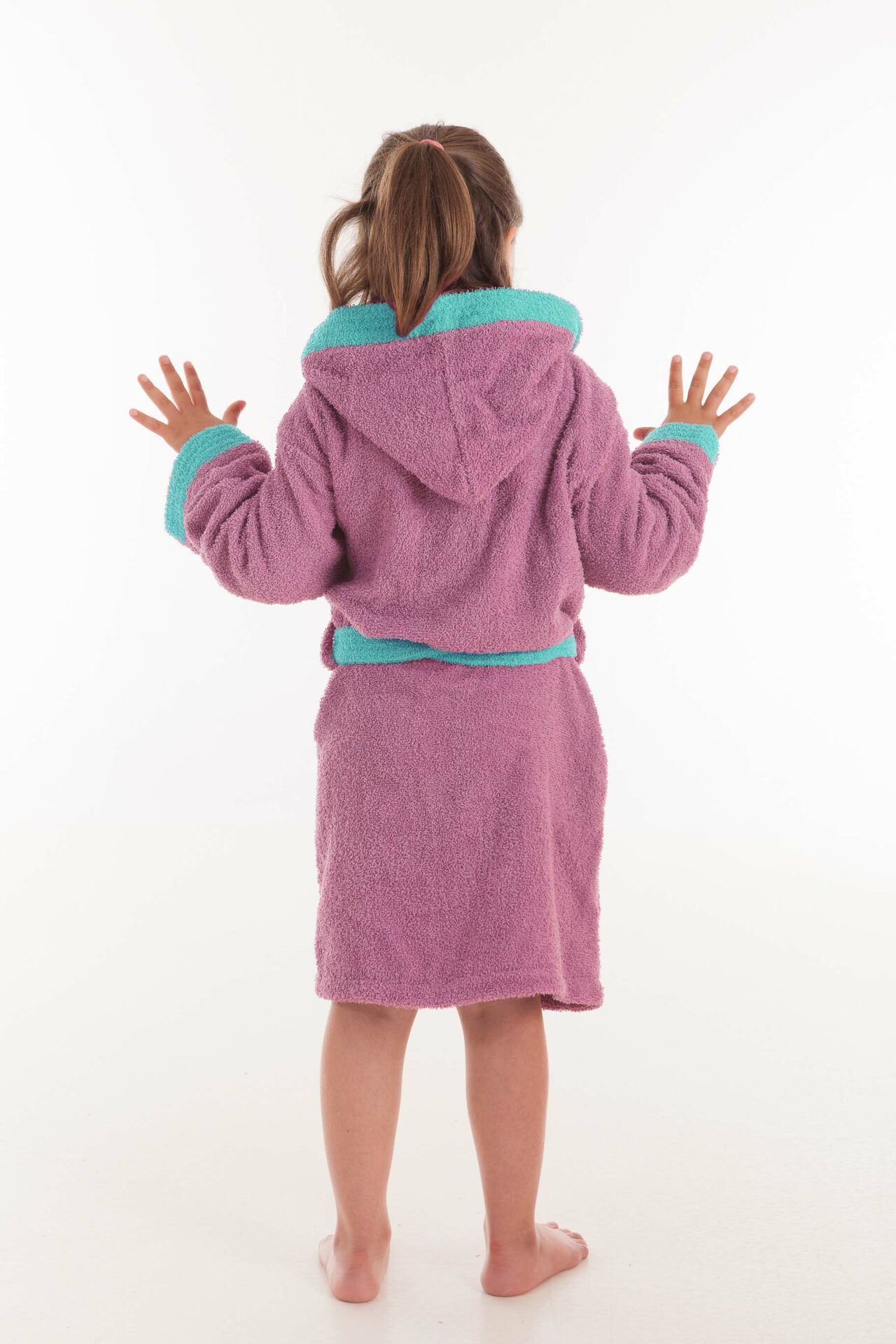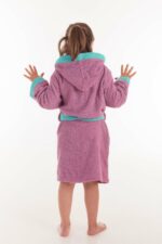 Albornoz de niña con capucha es de rizo, de color lila y con los detalles del cinturón y las tapetas del bolsillo en verde manzana, lleva un bordado de un unicornio en blanco y una nube con lluvia.