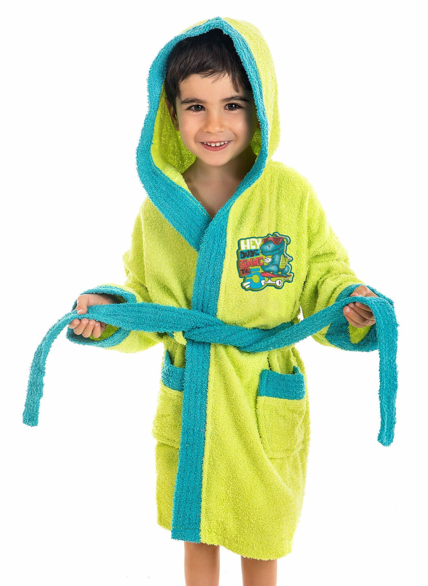 Albornoz infantil con capucha en verde lima y el cinturón, bolsillos y puño en verde, lleva un divertido dibujo de un cocodrilo.