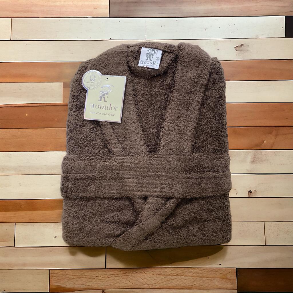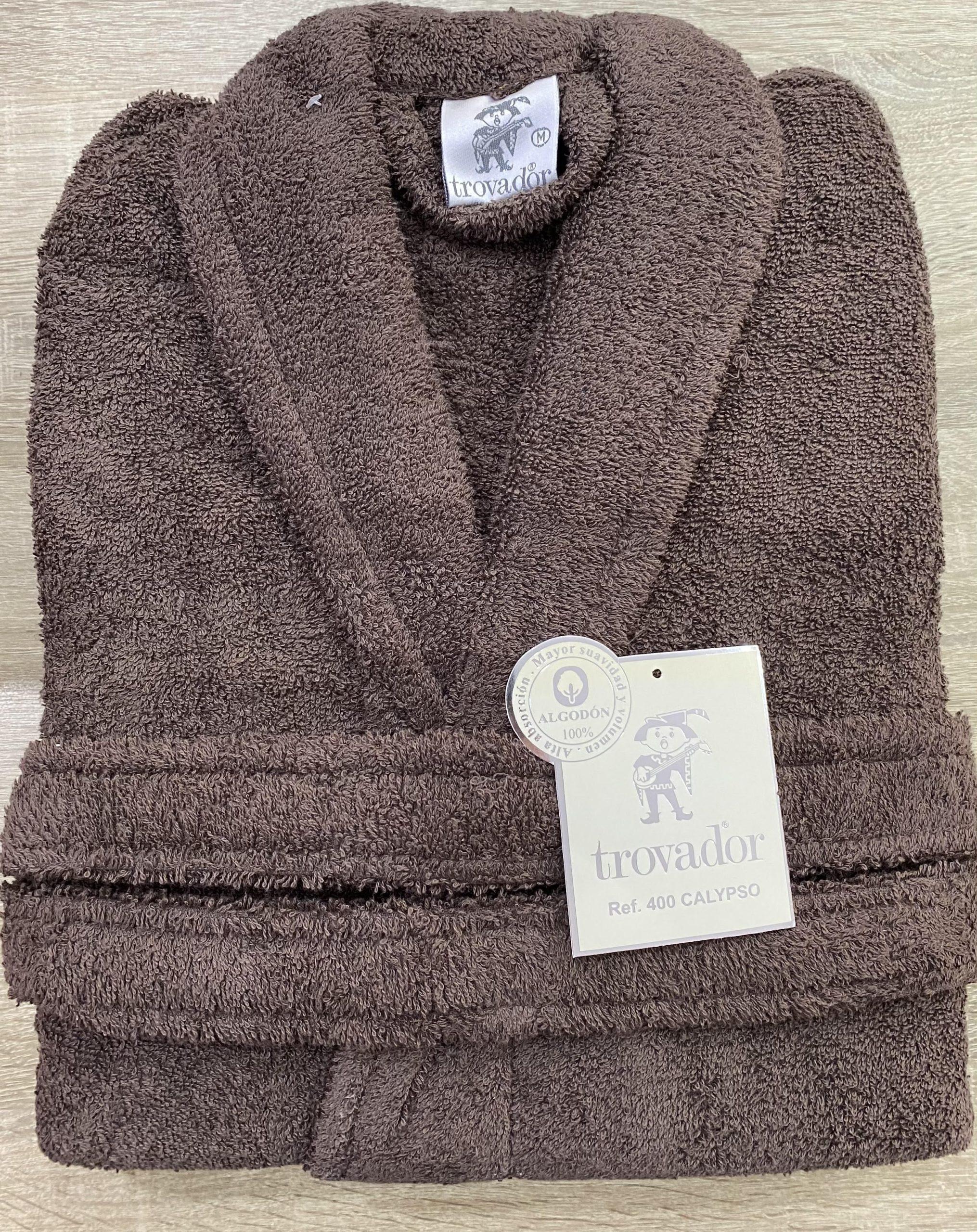 Albornoz color chocolate 100% algodón con la garantía de la marca Trovador. Con tejido de 400gr/m2 y tratamiento de alta absorción.